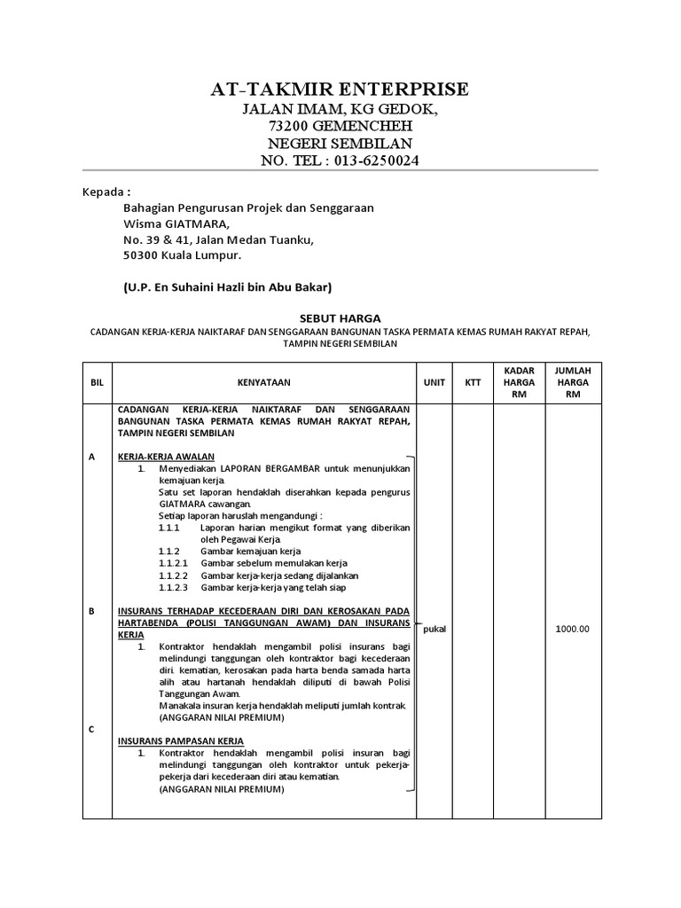 Bil Perkara Unit Kuantiti Kadar Harga 1 2 3 3 1 3 2 3 3 3 4 3 5 Syarat